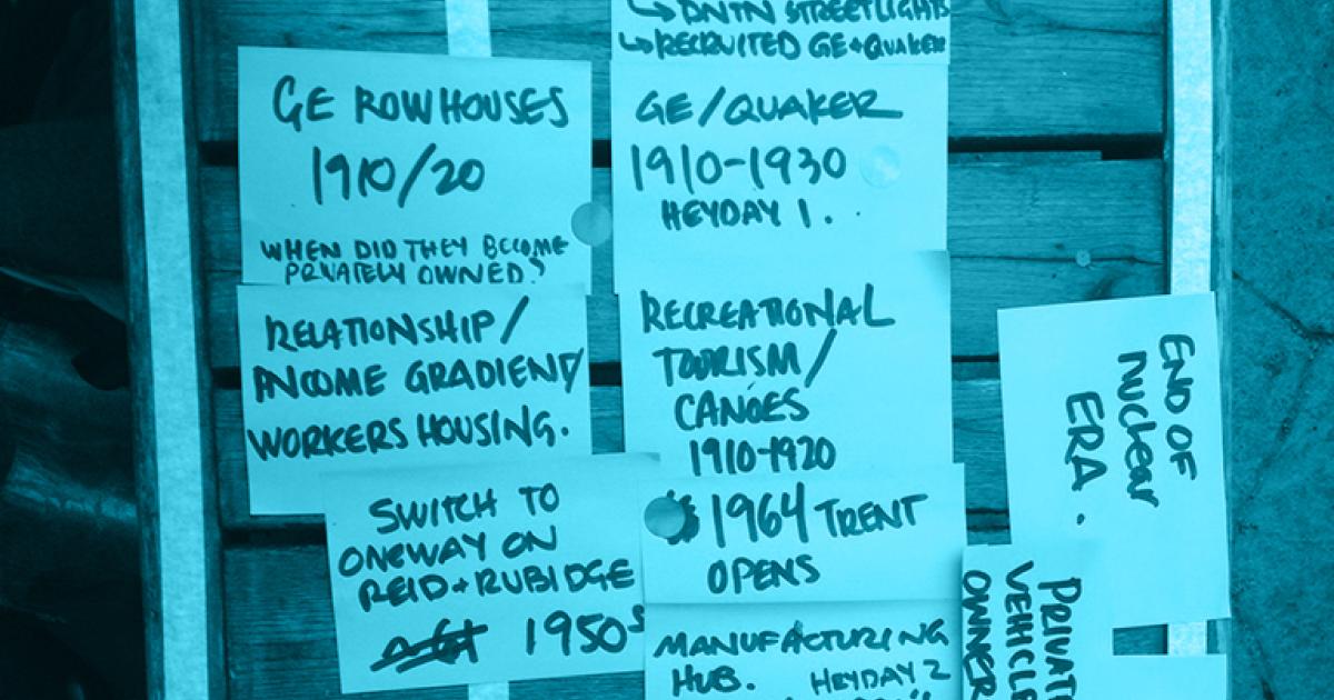 As a part of a workshop or pop-up session, construct a large-format timeline. Work with participants to place key information about the history of the neighbourhood on one level of the timeline, and history about the city/region as a whole on the other level.