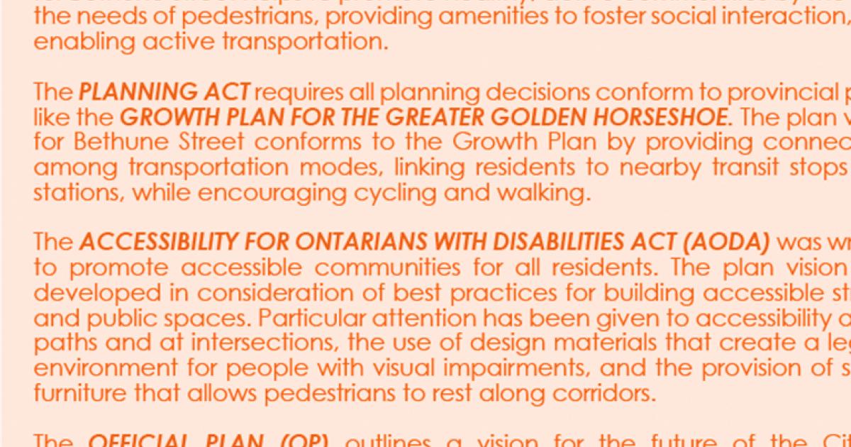 Conduct background research on the policy context in your community, including familiarizing yourself with provincial planning policies, your municipal official plan, and other local policies and plans (e.g. community improvement plans, transportation master plans, accessibility plans or others). Try to find areas where your project goals can align with policy and use policy goals to support and reinforce resident visions for their neighbourhood.